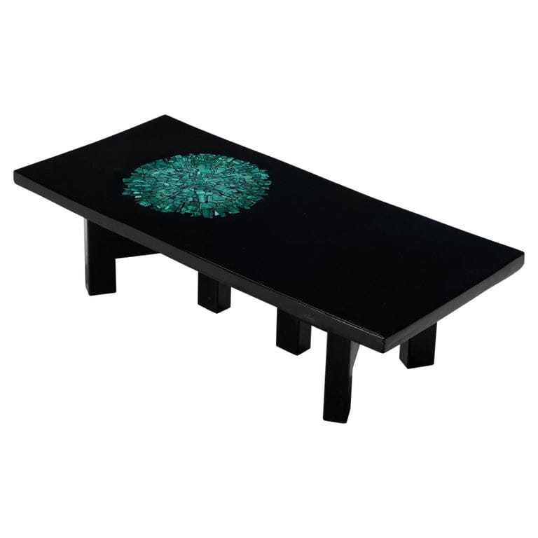 The piece that stopped me: a rectangular coffee table, black resin field, one side inlaid with crushed malachite in a dense banded mosaic. Lacquered steel base. The contrast between the flat black surface and that concentrated strip of deep green is what makes it work - the stone reads almost like it's lit from underneath even in photographs.